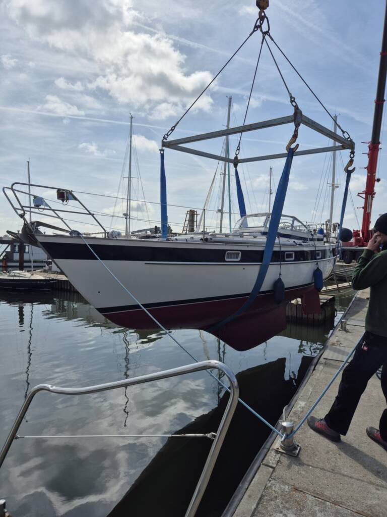Am Dienstag, den 29.04.2025 biegen wir mittags bei der Werft in Arnis um die Ecke und unsere Kajsa (Hallberg Rassy 352) hängt gerade in den Krangurten.