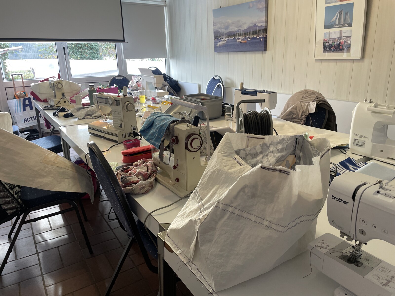 Bis 17 Uhr herrschte ein emsiges und harmonisches Treiben an den Tischen des Zuschneidens nach Schablonen für Segel und attraktiven Stoffresten (von Dagmar herangetragen) und an dem verlängerten Nähtisch wurden 10 Nähmaschinen von ihren Besitzerinnen zum Zurren gebracht, begleitet von Dagmars und Danielas fachlicher Unterstützung, sowie von angenehmer Hintergrundmusik.