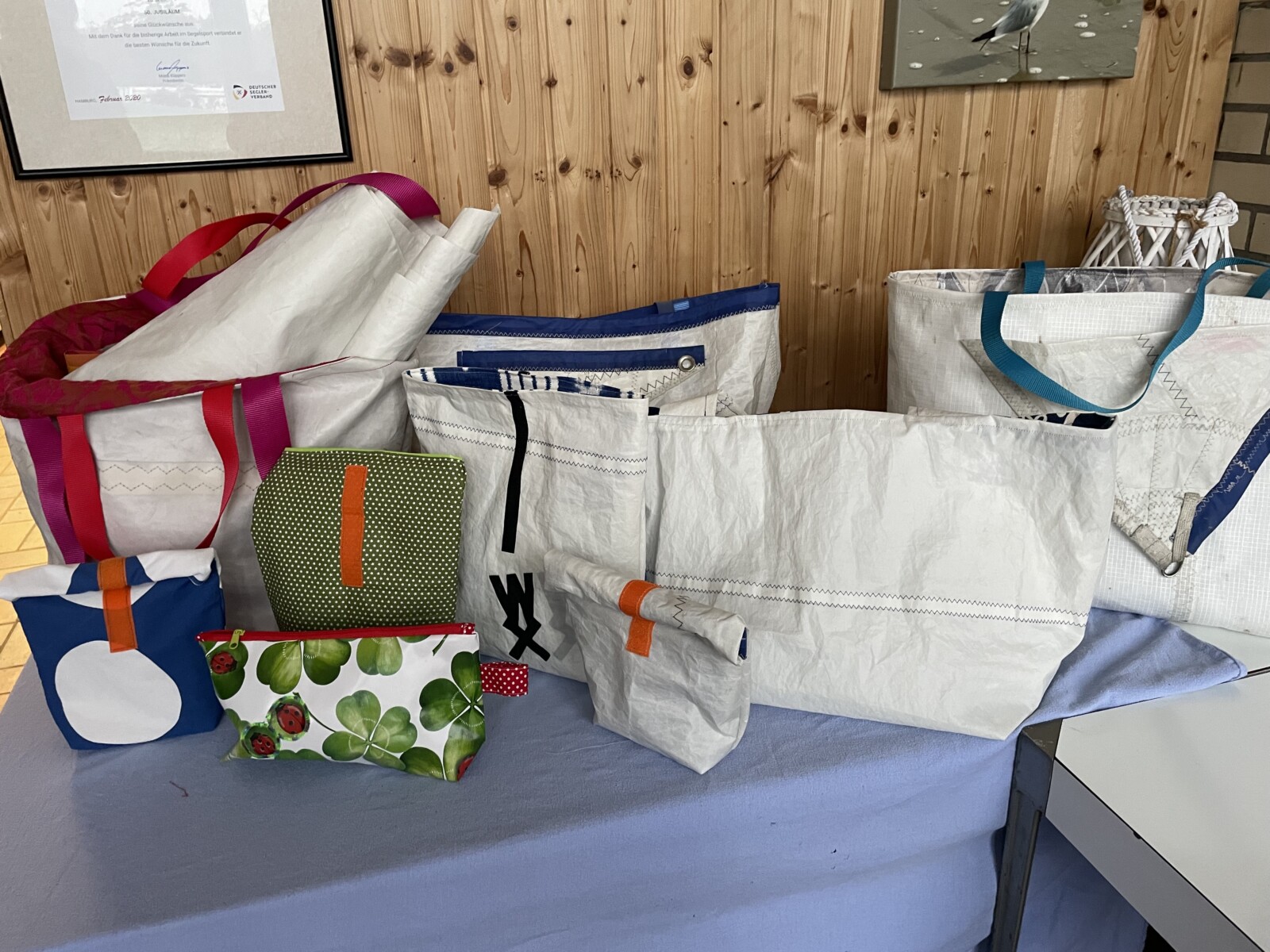 So trafen sich am Sonntag, dem 23.11.25 um 10 Uhr die, 10 angemeldeten Teilnehmerinnen der SKU, in unterschiedlichster Altersstruktur und handwerklichen Kenntnissen von erfahren und „Jahrzehnte eingeschlafen“ bis hin zu „keinen Kenntnissen“, bewaffnet mit ihren elektrischen Nähmaschinen und Equipment im Clubhaus mit dem entschlossenen Willen, die ausgemusterten Segel zu attraktiven Taschen zu nähen.