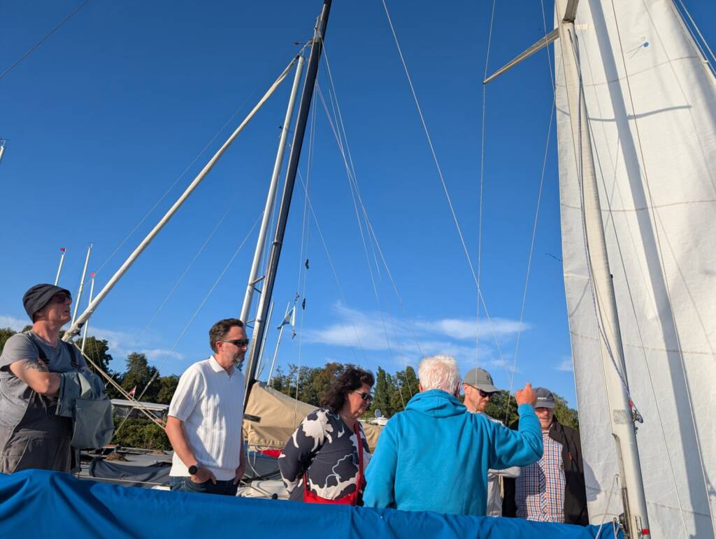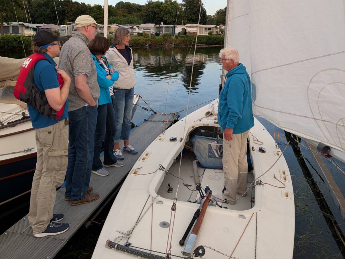 Bevor es abends nun endgültig zu früh dunkel wird versammelte sich noch einmal ein kleines Grüppchen – bewusst in kleiner Runde, denn der Steg gab selbst unter dem Gewicht der wenigen Anwesenden teilweise bedenklich nach. Diesmal bei gehissten Segeln am Steg versuchten wir jene Falten im Segel zu erspähen, die über die letzten Grad und Zehntelknoten an der Kreuz entscheiden können. Herzlichen Dank an alle Teilnehmer und unseren Dozenten Kalle – bis wir das Thema Trimm auch im nächsten Jahr wieder aufgreifen werden.