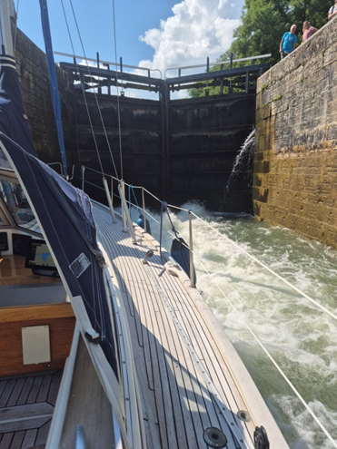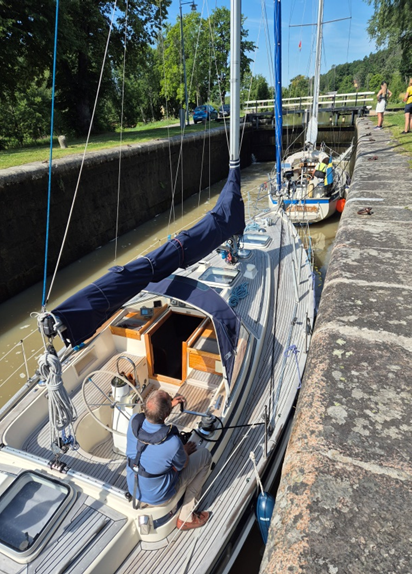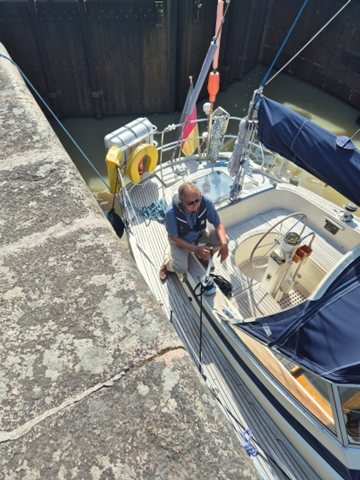 Beim Aufwärtsschleusen wird die Achterleine senkrecht nach oben straff belegt und die Vorleine einige Meter vor dem Bug. Die über die Vorschiffsklampe nach achtern umgelenkte Vorleine wird dann auf eine Winsch geführt um bei steigendem Wasserstand das Schiff immer an der Schleusenwand zu halten. Zum Belegen der Vor- und Achterleine steigt ein Crewmitglied mit beiden Leinen vor der Schleuse an Land. Zum Teil gibt es Doppelschleusen mit zwei Kammern unmittelbar hintereinander und sogar Schleusentreppen wie in Berg. Dort geht es über insgesamt sieben Kammern knapp 20 Meter nach oben.