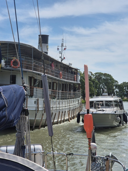 Diese benötigen in Kurven den äußeren Bereich des Fahrwassers, so dass gegebenenfalls Steuerbord an Steuerbord passiert wird. Die Passagierschiffe zeigen dies durch zwei kurze Signaltöne an (und freuen sich, wenn man das Signal bestätigt).