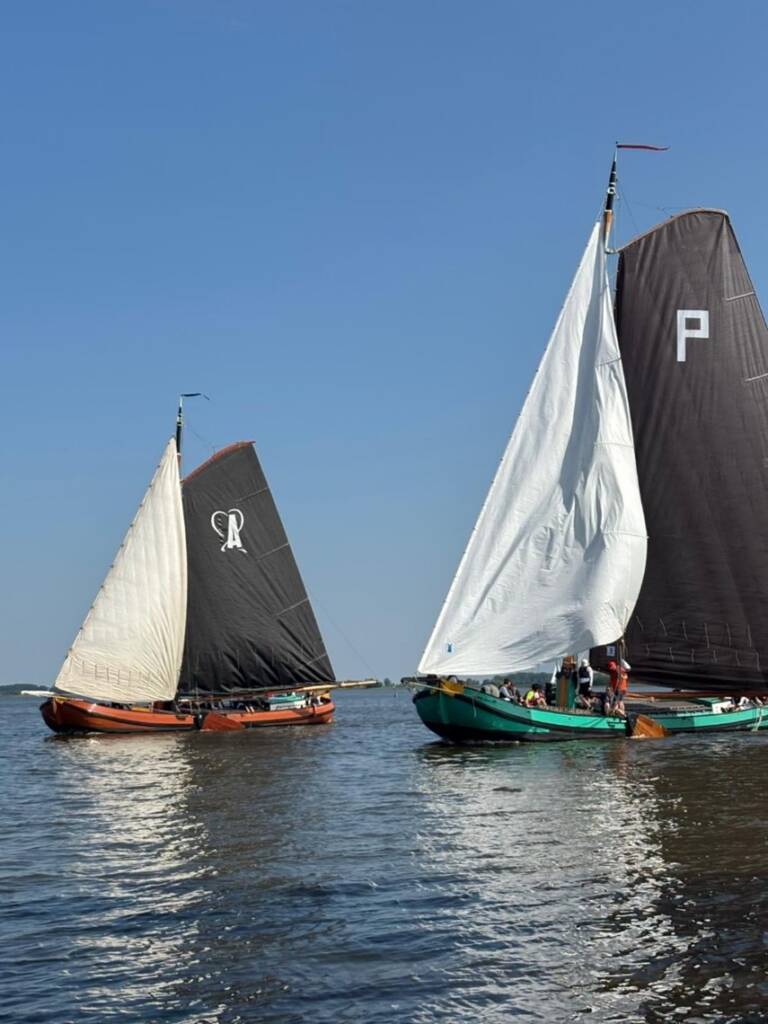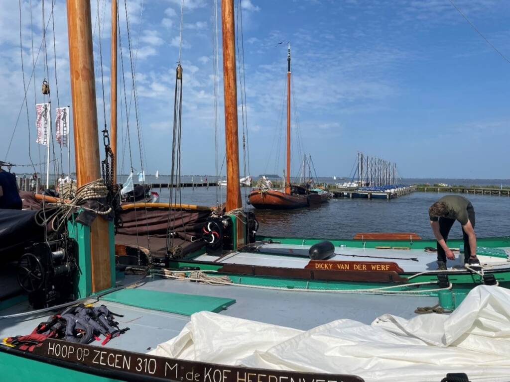 Nach den Rennen sind wir zu einer Nachmittagsverpflegung zu Badmeester Keimpe in den Hafen von Balk gesegelt. Dann kam es zuvor angekündigten „Sailing Surprise“: Hierzu liefen auf einmal 4 Traditionsschiffe, Plattbodenschiffe der A-Klasse, mit einer Länge von rund 20 m zügig in den Hafen ein und machten als großes Päckchen ggü. unserer Valken fest.