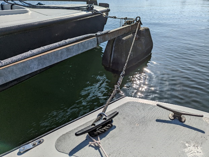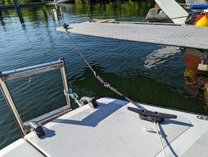 | Nach dem Segeln | Ruderblatt aufholen und fixieren, Schwert bleibt unten Achterleinen an den Klampen befestigen (s.a. Fotos) Lenzklappen (hinten) bei Verlassen des Bootes unbedingt öffnen! Es ist ausreichend, die Gummileine vom Haken zu lösen. Das Einhängen der Lenzbälle an Badeleiter oder Klampen ist weder notwendig noch sinnvoll (Materialermüdung). Im Bedarfsfall können die Lenzbälle etwas von den Öffnungen weggezogen werden (s.a. Fotos am Ende der Segelanweisung). Großsegel aufrollen und unter der Baumpersenning verpacken, Großschot aufschießen und aufhängen. Die Fock am Vorliek vom Kopf zum Hals aufrollen (lange Tüte), das untere Drittel kann man einschlagen bis zum Fenster, das ganze dann in den Bugraum weit nach vorne schieben, so dass das Stück mit der Schot im Netz zu liegen kommt, die Schot locker aufschießen und oben drauf legen, so dass sie trocknen kann. (s.a. Foto). Boot reinigen! |
