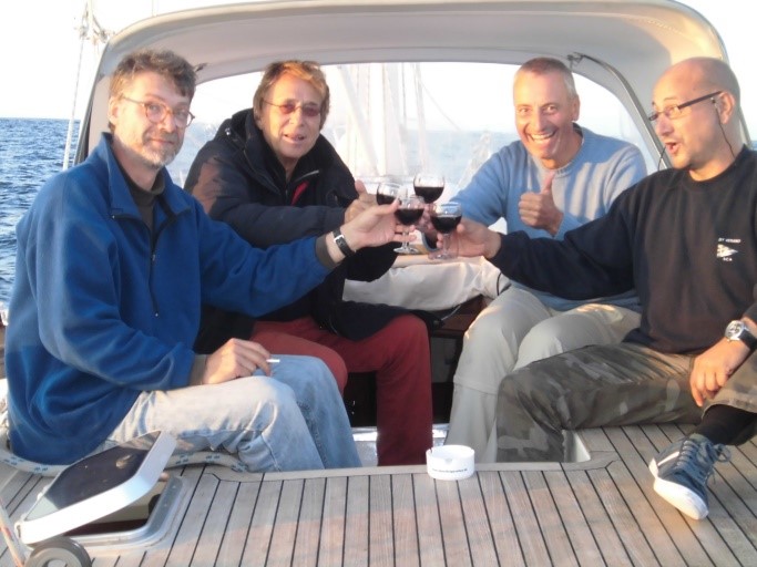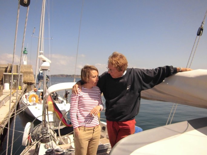 Nach weiteren zwei sehr schönen Segeltagen und durchschnittlich 6,5 bis 7 Knoten Fahrt im Schiff liefen wir allmählich auf die britische Kanalmündung zu und entschlossen uns, einen schönen und wohlverdienten Landaufenthalt vor der französischen Nordwestküste einzulegen. Nachdem Dieter endlich wieder genesen war, konnte er gar nicht mehr aufhören, von der köstlichen Seafood-Platte zu schwärmen, die wir anschließend tatsächlich auch alle sehr genossen haben. Zu den leckeren Austern und anderen Schalentieren gab es noch einen gut gekühlten Riesling aus dem Elsass. Doch auch hier steckt der Teufel wieder im (technischen) Detail: Nach mehrtägiger Fahrt wollten wir gleich bei der Ankunft Diesel bunkern und legten sehr souverän und professionell an der Tankstelle vor der Hafeneinfahrt an, um das Boot vom Salzwasser zu reinigen und zu betanken. According to Murphys Law sprang natürlich der gute alte Perkinson wieder nicht an, als wir an der Reihe waren und auch der (gerade zuvor in Lissabon neu eingebaute) Anlasser hielt sich außergewöhnlich geräuschlos zurück. Sollte sich unser Perkinson tatsächlich als Anlasserkiller gerieren? Nach kurzer Alarmierung der Ersatzteilversorgungskette konnte unser Skipper unkonventionell einen französischen Bootstechniker gewinnen, sich dieser Herausforderung kurzfristig zu stellen. Nach nur 10 Minuten: Entwarnung, es war nur ein Kabelbruch bzw. ein kleineres, elektronisches Problem und unser Törn konnte am nächsten Tag planmäßig weitergehen. Endlich gab es auch wieder schöne Warmwasserduschen und schon hat sich das nach 4 Tagen auf See „etwas angestaubte Bordaroma“ rasch wieder verflüchtigt, als wir uns für den lang ersehnten Landgang fein machten – und die frischen Meeresfrüchte, … einfach lecker! Am nächsten Morgen wurden wir von unserer herzlich guten Fee, der lieben Alexandra, die uns abends im Seafoodrestaurant noch liebevoll und sehr zuvorkommend bedient hat, mit einem opulenten Frühstück überrascht – unglaublich!