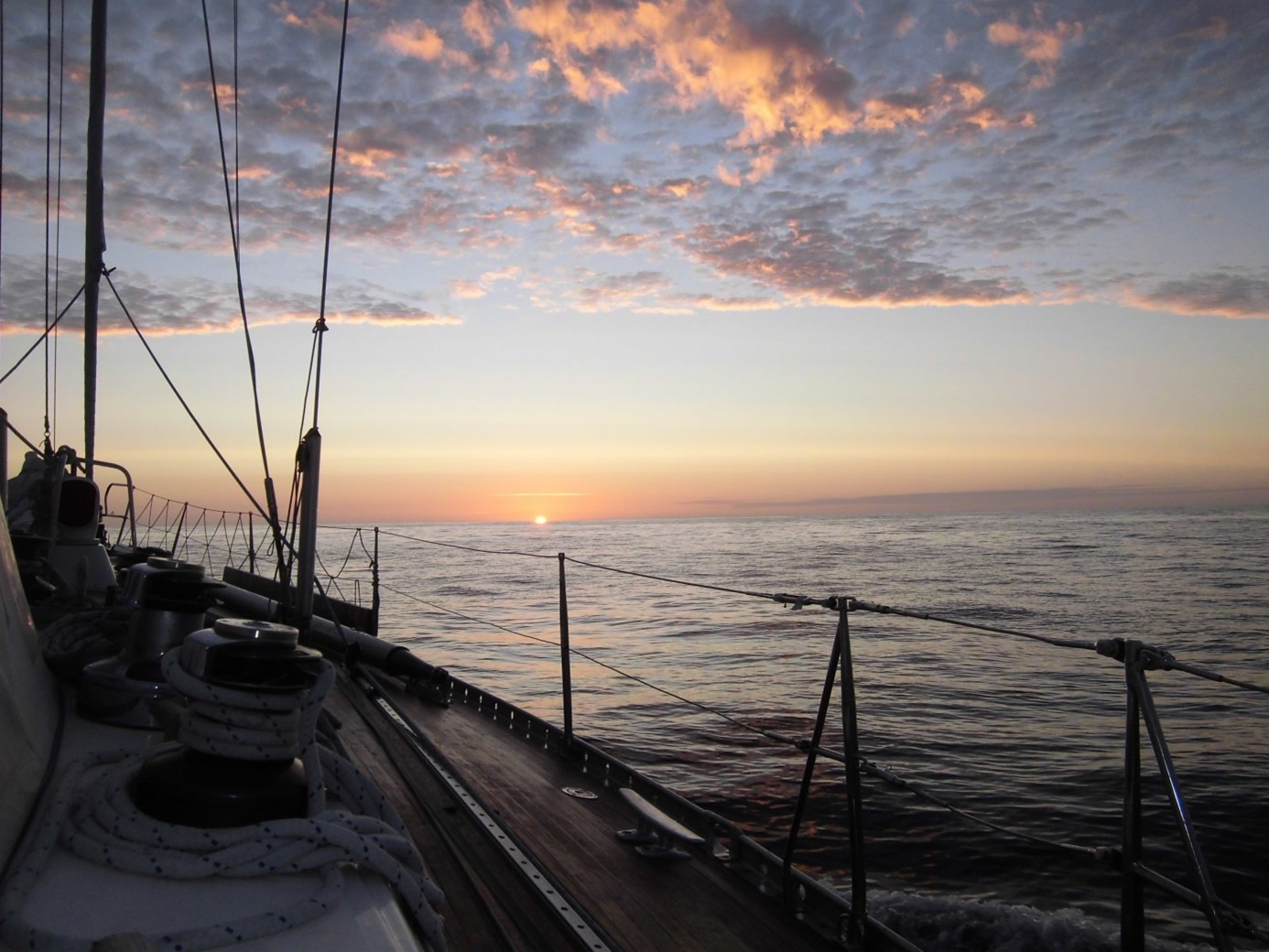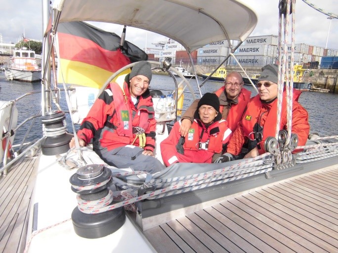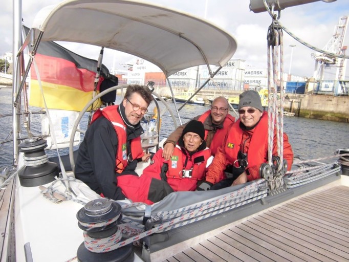Als ich am Sonntagabend nach einem ausgiebigen Crew-Dinner kurz vor Mitternacht an Bord ging, habe ich einfach mein Gepäck in meiner Backborddoppelkoje abgelegt und schon ging es los – auf nach Porto! Die erste Crew bestand zunächst aus nur einem Profiskipper und einem jungen Segler, der die Verano seit etwa einem Jahr kennt. Die Atlantikpassage wurde zuvor in 4-5 Segeltagen erfolgreich absolviert. Bei der Ansteuerung auf Lissabon nahm jedoch der Wind in den letzten 10 Stunden auf bis zu 44 Knoten zu und wehte vermehrt aus Norden. Insofern wollte der Skipper die Segel bergen und den Motor anwerfen. Als jedoch der Anlasser auch nach mehreren Versuchen seinen Dienst versagte, blieb nur Aufkreuzen im dritten Reff und Sturmfock bzw. Kuttersegel auf dem Vorschiff – gegen an! Auch das Einlaufen ohne Maschine in den Tejo River verbot sich bei starkem Verkehrsaufkommen, sodass die Verano in den vor Lissabon vorgelagerten Hafen von Cascais eingeschleppt werden musste. Ein neuer Anlasser war bereits angeliefert und wurde vor meiner Ankunft noch am Samstag eingebaut. Mit einsatzbereiter Maschine ging es nun zu Dritt weiter nach Porto bzw. in den vorgelagerten Industriehafen von Leixeos. Ich wurde sehr freundlich aufgenommen und rasch haben wir uns als Team zusammengefunden. Die (Einzel-) Wachen wurden vom Skipper tagsüber im 4- und nachts im 3-Stunden-Rhythmus gesegelt. Auch wenn die beiden nach der anstrengenden Lissabon-Ansteuerung erst einmal genug vom Segeln hatten, wollte ich ganz gerne Segel setzen, aber die kontinuierliche Südströmung (Portugalstrom) und vorherrschend aus Norden wehende Winde (Norder!) ließen uns keine Chance. So motorten wir bei einer mäßigen, langen (12s) Dünung von 3-4 Metern durch die Nacht und den folgenden Tag, schließlich stand für den Skipper eine pünktliche Delivery im Vordergrund. In den letzten 5 bis 6 Stunden vor unserem Zielhafen zogen sich dicke Nebelpakete zusammen und die Sicht reduzierte sich auf annährend Null Meter – plötzlich waren wir ein „moving target“ für die Großschifffahrt. Unsere Radarantenne drehte sich munter, erzeugte aber leider nicht das erhoffte Bild. Also aktiven Radarreflektor an, zur Unterstützung der besseren Sichtbarkeit in Verbindung mit unserem feucht-nassen Großsegel und dazu engmaschige AIS-Überwachung. Auch wenn die zahlreichen Fischerreusen vor der portugiesischen Küste schon lange nicht mehr auszumachen waren, konnten wir doch mit dem AIS-Signal zumindest der Berufsschifffahrt und den vielen Fischerbooten einigermaßen zuverlässig ausweichen. Bei der Endansteuerung auf Leixoes klarte es erfreulicherweise wieder vollständig auf, sodass wir dort sicher einlaufen und dienstags nach rund 160sm gegen 04:40 Uhr auch sicher fest machen konnten. Die erste Etappe war erfolgreich geschafft und die Yacht lag nun pünktlich für den nächsten Crew-Wechsel bereit. Nach wenigen Tagen Aufenthalt traf die neue Crew um den Yachtmanager und neuen Skipper, Rainer Seehase am Mittwoch und Donnerstag ein und die Verano wurde fertig gemacht für die nächste Etappe (reinigen, bunkern, 400l Diesel und 700 l Trinkwasser tanken, etc.). Fortan waren wir zu fünft und liefen am Donnerstag gegen 18:00 Uhr aus, in Richtung britischer Südküste. Die Navigations- und Wetterstrategie war, zunächst hoch am Wind in den offenen Atlantik auszulaufen, um dort (hoffentlich) günstigere Windbedingungen für den langen Nordkurs zu finden und zugleich das aufkommenden Tief abzuwettern, dass sich mit 9 bft auf die Biskaya zubewegte. Gute Strategie, aber leider viel zu wenig Wind, sodass wir bei lediglich nur noch 2 Knoten Fahrt im Schiff und deutlich abfallender Höhe, schließlich entnervt wieder den guten, alten Perkinson anwarfen und ganze zwei (!) Tage gen Norden motorten – ätzend! Das Atlantiktief zog erwartungsgemäß durch die Biskaya und hinterließ uns eine sportliche Dünung von teilweise sogar über 4 Metern, aber langen Wellen. Ach ja, die Fische hatte ich natürlich auch schon am ersten Tag nach Lissabon gefüttert, sodass ich inzwischen robust seefest war. Alleine das Kochen und Spülen unter Deck gelang mir anfangs noch nicht so gut, aber am Ende war auch das O.K. Und dann, endlich Wind … und das auch noch aus der richtigen Richtung. Ich habe sogar noch in der nächtlichen Hundewache die Segel gehisst. Überhaupt, die Hundewache! Vor der durchgehend 4-stündigen Crew- und Wacheinteilung machte sich einer unserer Segelkameraden Dieter besonders stark für die wenig populäre Hundewache im O-Ton: „völlig unproblematisch“. Auf meine anfängliche Erleichterung folgte die rasche Ernüchterung unmittelbar auf den Fuß – ich wurde zusammen mit Dieter für die Hundewache eingeteilt und zwar für den Rest des Törns. Mein Glück war nahezu perfekt, als Dieter schließlich noch seekrank wurde und für die folgenden 3 Tage lediglich seine Schlafkoje gegen einen sicheren Schlafplatz am Oberdeck wechselte. Aber der wiederkehrende, nächtliche Sternenhimmel war von 02:00 bis 06:00 Uhr wirklich immer wieder atemberaubend und so segelte ich sicher durch die lauwarmen Nächte – immer wieder Dieter im Augenwinkel, damit er gut gesichert an Bord blieb – was für ein Erlebnis !