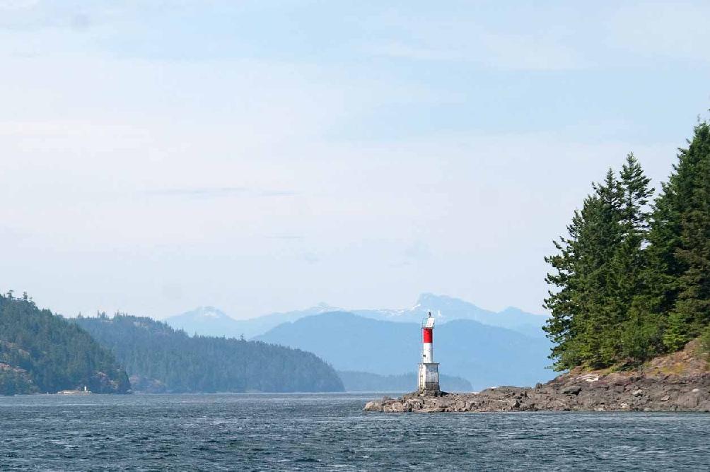 Anschließend runden wir den Norden von Marina Island und segeln Richtung Quadra Island dessen Südzipfel wir ebenfalls umfahren, um Richtung Nordnordwest nach Campbell River zu segeln. Noch läuft der Gezeitenstrom gegen uns. Wir passieren das Leuchtfeuer Cape Mudge.