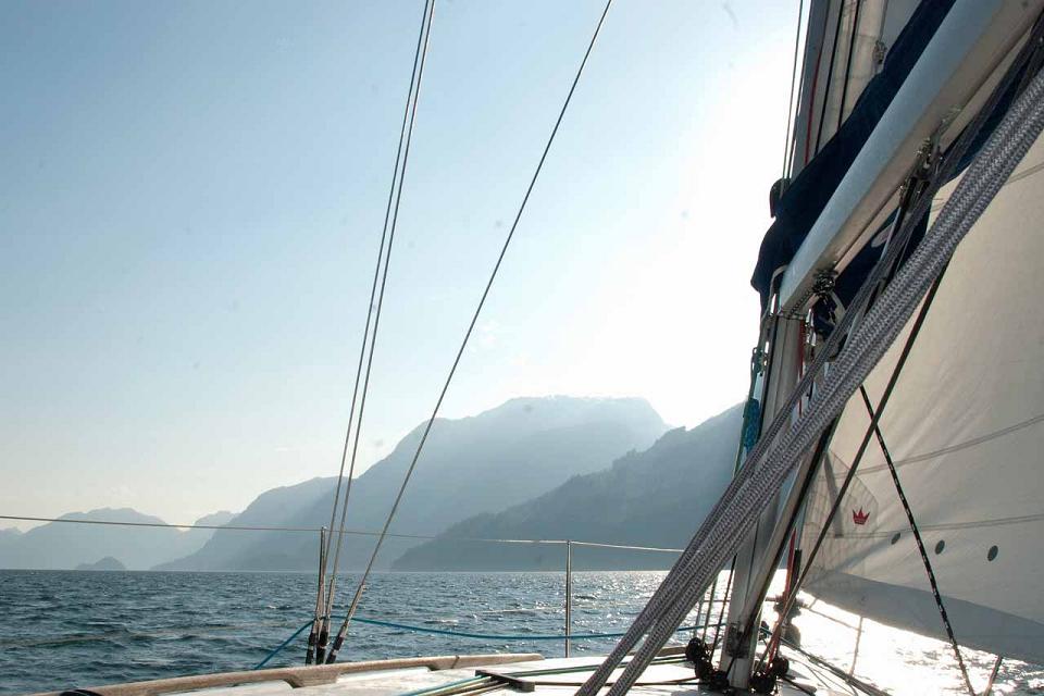 Bei schwachem Wind setzen wir Kurs ab auf den nahe gelegenen Howe Sound. Mittlerweile ist strahlender Sonnenschein. Wir tauchen gerade einmal 2 Stunden nachdem wir Großstadt Vancouver verlassen haben, in der kanadischen Natur ab. Wir segeln bei 3 Windstärken in dem landschaftlich ausgesprochen schönen Howe Sound, Rings um uns her bewaldete Inseln.