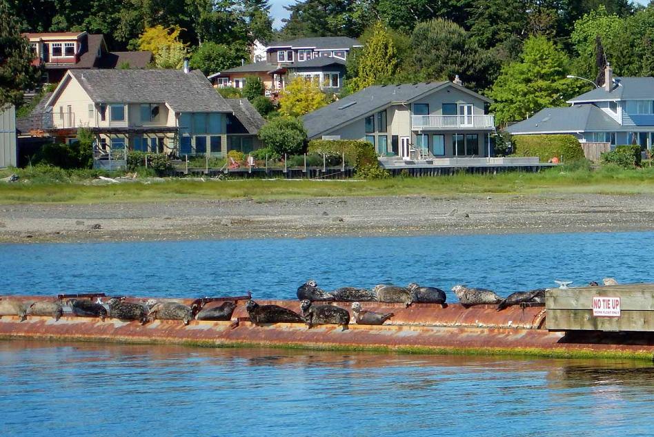 Nun wollen wir weiter südlich noch einmal Vancouver Island anlaufen. Die Stadt Comox ist unser Ziel. Hier gilt es eine langgestreckte dem Land vorgelagerte Sandbank zu passieren. Lediglich eine kleine Passage erlaubt die sichere Durchfahrt. Durch die Baker Passage gelangen wir wieder auf die Strait of Georgia. Einige Stunden später passieren wir das Flach „Comox Barre“ und laufen alsbald in der Comox Public Wharf ein. Zahlreiche Seehunde schauen uns von einem Schwimmponton interessiert zu.