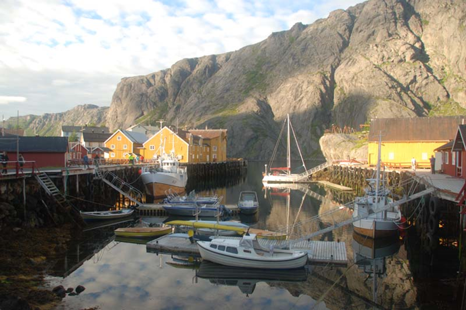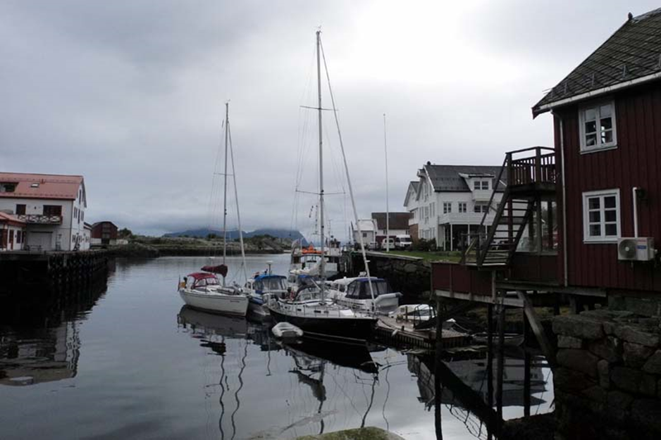 Am frühen Morgen angeln wir noch 2 Makrelen. Dann geht es bei südlichen Winden nach Henningsvær. Es ist wieder stark bewölkt und regnet etwas. Henningsvær ist ein traditionelles Fischerdorf verteilt über eine Vielzahl von Inseln die zusammen einen geschützten Naturhafen bilden. Wir machen im Päckchen längsseits an einer Alu Yacht aus Kanada an dem Steg eines Hotels fest und erkunden den Ort.