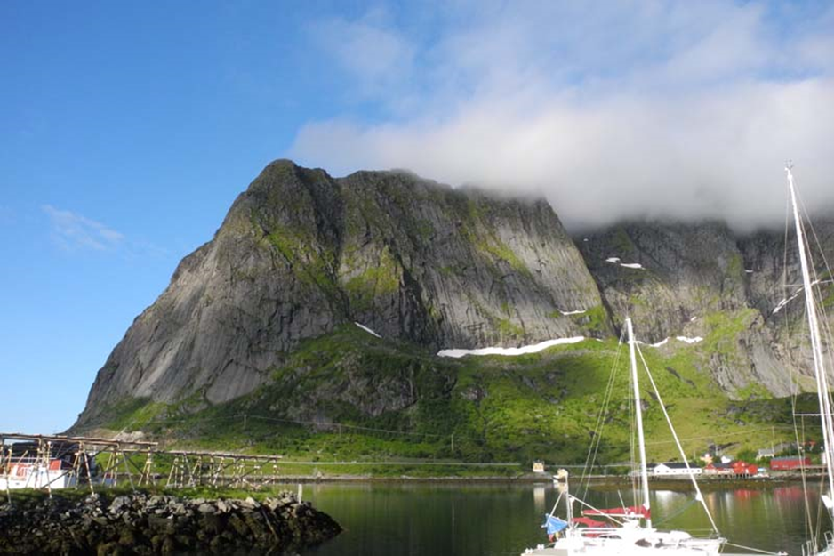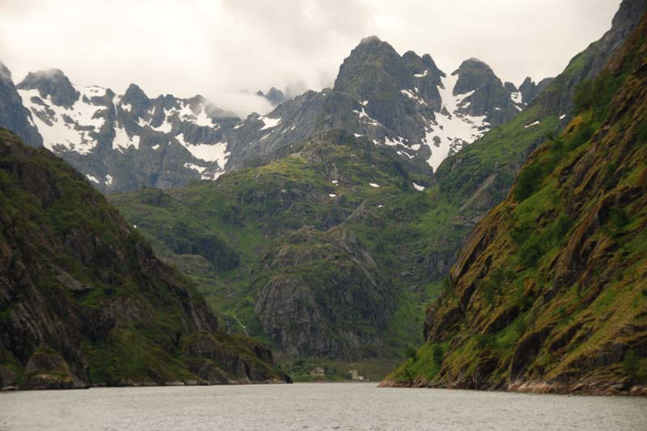 Danach geht es bei wenig Wind unter Maschine weiter zum Nusfjord. Mittlerweile ist es wieder stark bewölkt.