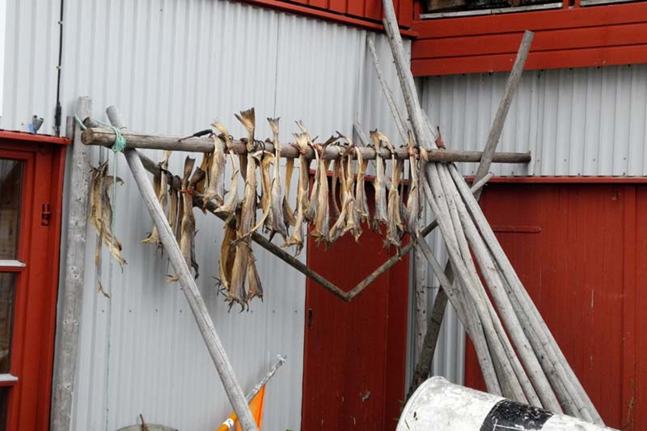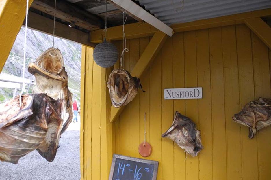 Selbst vor unserer Herberge steht ein Holzgestell zum Trocknen von Fisch bekannt als Stockfisch. Der Fisch, meist Kabeljau, wird direkt nach dem Fang ausgenommen und meist von Februar bis Mai auf Holzgestellen im Freien getrocknet. Anschließend wird der Fisch für weitere 2 bis 3 Monate in trocknen belüften Räumen getrocknet. Der größte Anteil des in Norwegen produzierten Stockfischs wird in Länder wie Portugal, Italien und Spanien exportiert. Mittlerweile taucht Stockfisch auch in Norwegen wieder auf der Speisekarte einiger Restaurants auf.