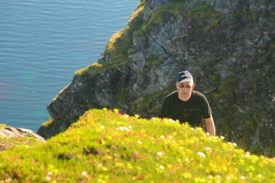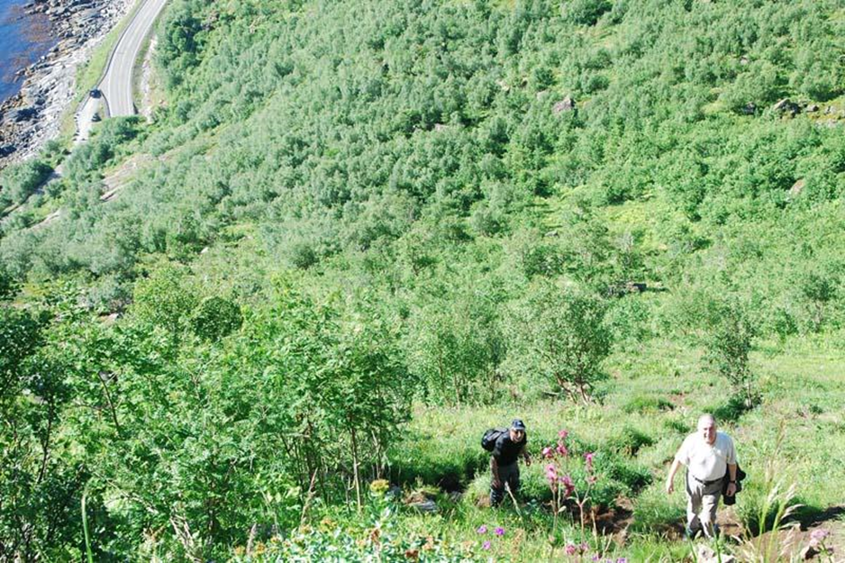 Bei diesem Wetter haben wir ideale Bedingungen für den Aufstieg. Zeitig machen wir uns auf den Weg. Nach 20 Minuten erreichen wir den Einstieg. Dieser ist mit einem großen weißen Pfeil auf dem Asphalt der alten Küstenstraße markiert. Unser Lofoten Reiseführer von Michael Möbius und Annette Ster beschreibt detailliert den Aufstieg: „Rund 60 Minuten haben wir noch vor uns, aber es werden durchschwitzte Minuten sein: Denn beträgt die Steigung zu Beginn rund 45 %, bald schon 60 %, so steigert sie sich ab 200 m Höhe auf 70 %. Die ganze Zeit über wird man das Gefühl nicht los, als würde man eine senkrechte Wiesenwand hinaufkraxeln.“