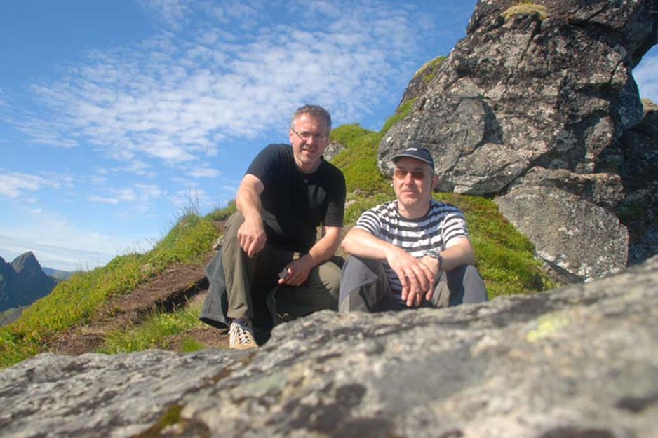 Nach einer guten Stunde erreichen wir auf allen vieren den Sattel und sind vor lauter Begeisterung sprachlos. Mehr als 400 Meter unter uns sehen wir unsere Yacht. Der Reinefjord leuchtet im Sonnenschein in den unterschiedlichsten Blau und Grün Tönen. Der Blick nach Norden auf die Lofoten und die ruhige See – beeindruckende und unvergeßliche Momente lassen die Strapazen der letzten Stunde schnell vergessen.