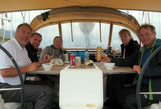 Praktisch, denn so wurden beim Einlaufen in den kleinen Hafen unsere Heckleinen von den Clubkameraden entgegen genommen. Kaum hatten wir die Muring aufgenommen und festgemacht, begann es stark zu regnen, wir konnten gerade noch rechtzeitig die Bimini und die Sprayhood hochziehen. Die Besatzungen der nach uns einlaufenden Boote waren patschnass. Der Regen wurde immer stärker, so dass wir wieder an Bord aßen, es uns gemütlich machten, Karten spielten und zu Ediths Akkordeonmusik nach einigen Gläsern Wein immer melodischer sangen.