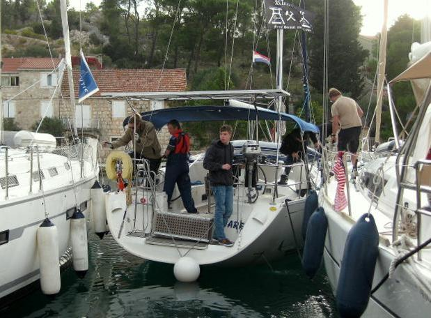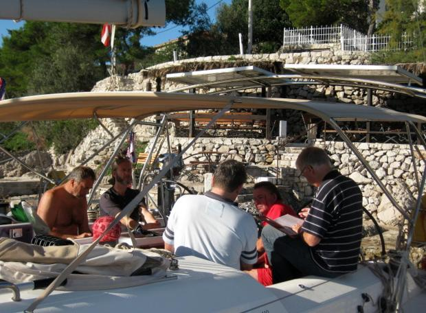 Vor dem Frühstück genossen wir ein Bad im Meer, liefen dann aus in Richtung SV.Klement, eine kleine Hvar vorgelagerte Insel. Leider hatten wir kaum Wind, so dass wir vorwiegend unter Motor liefen. Dafür hatten wir aber wunderbaren Sonnenschein und konnten mal so richtig faul sein. Festgemacht wurde dann in der schönen Bucht Palmizana, in der natürlich noch weitere Yachten an den Bojen lagen. Nach einem erfrischendem Bad im Meer gab es an Bord das obligatorische Abendessen: Nudeln mit Tomatensoße.