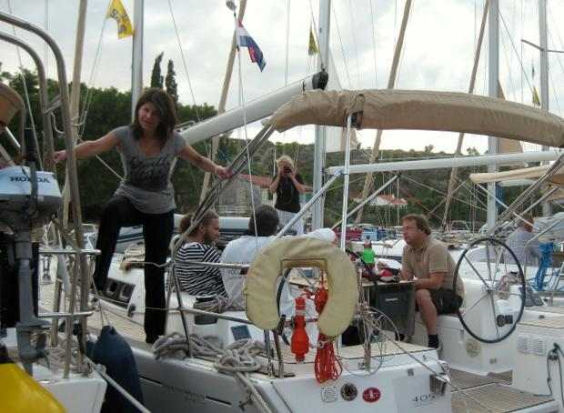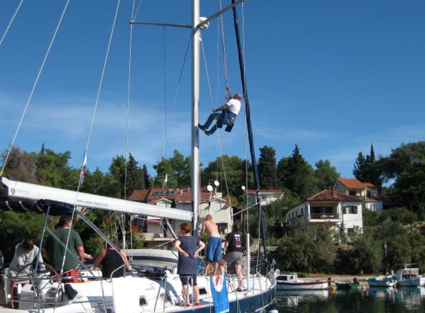 Es tat sich einiges dort unten. Bei einer kroatischen (?) Mannschaft wurde ein Mutiger im Bootsmannstuhl nach oben gezogen. Auch in unserer Flotille passierte etwas Unvorhergesehenes. Uwe musste nach einer Muring tauchen, die sich in der Schraube verfangen hatte. Beide Vorgänge fanden viel Beachtung bei uns Zuschauern.